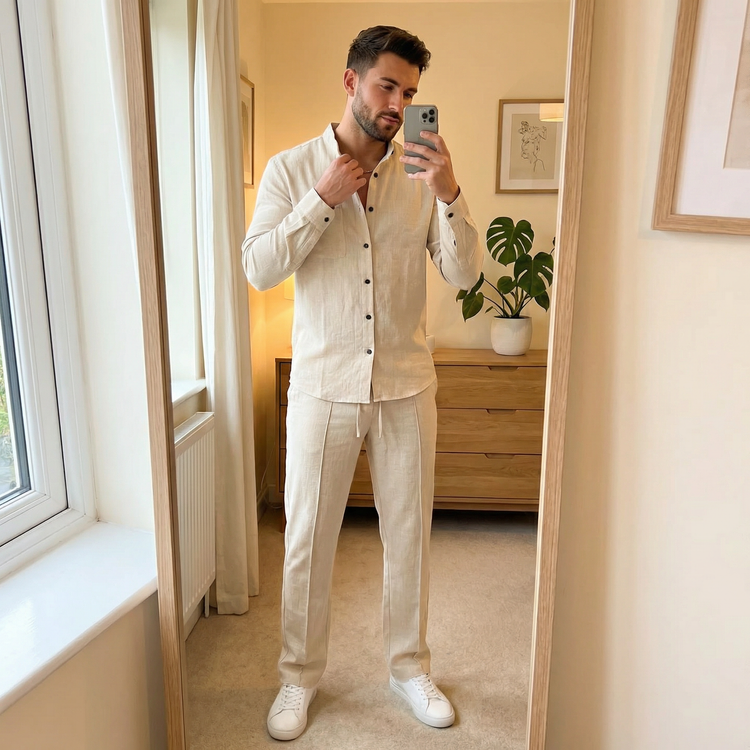 Traje muy bonito, elegante pero con un estilo relajado. Es cómodo y la tela se siente agradable. Para mi gusto, el pantalón podría quedar un poco más ajustado, pero en general estoy muy satisfecho.