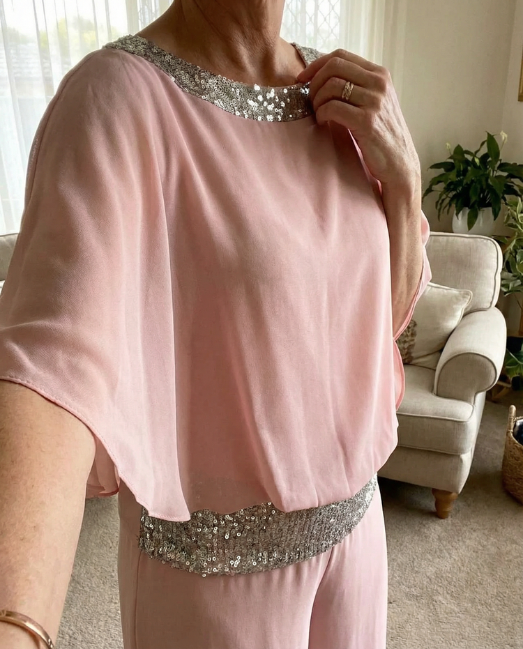 Estoy muy satisfecha con mi compra. La tela cae muy bien y se siente agradable. El detalle brillante le da un toque elegante sin ser exagerado. Lo único es que me quedó un poco más suelto de lo que esperaba, pero por lo demás es un conjunto muy bonito y elegante.