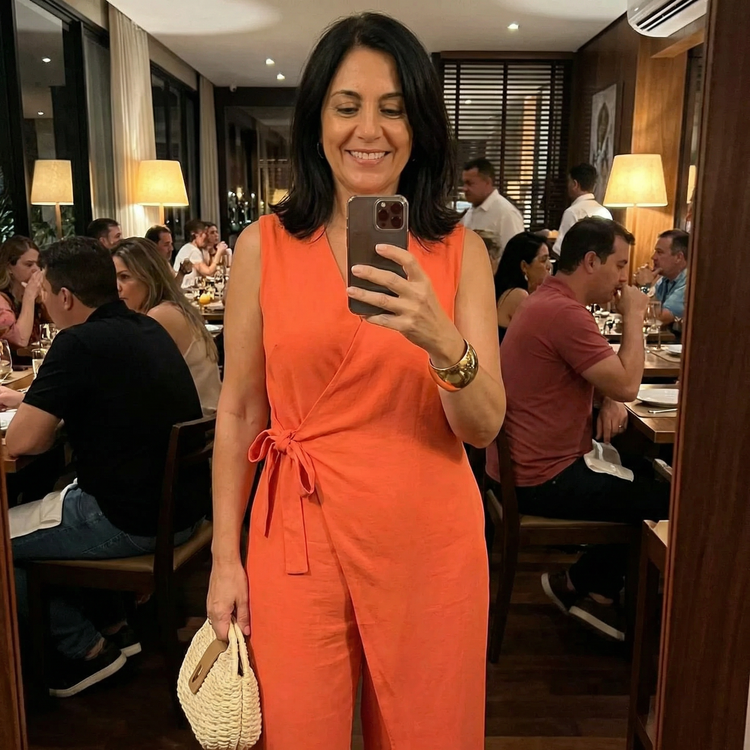 Conjunto muy bonito con un color precioso. Es cómodo y queda elegante pero también alegre. La tela se arruga un poco rápido, pero por lo demás estoy muy contenta.